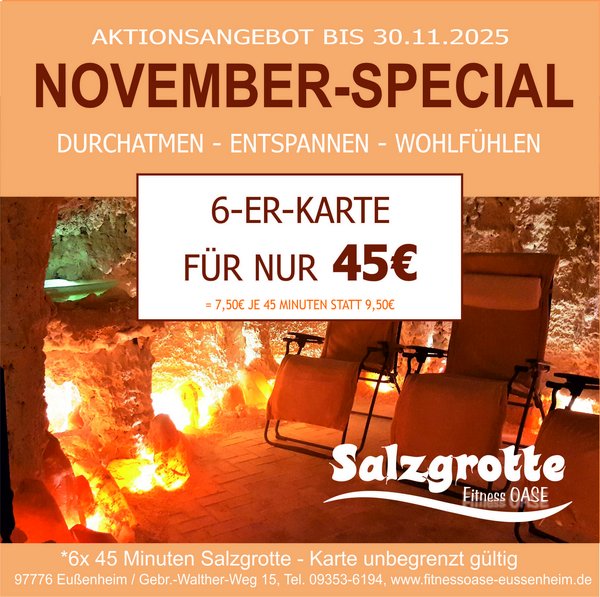 Gönnen Sie sich eine wohltuende Auszeit in der Salzgrotte Fitnessoase und tanken Sie neue Energie für Körper und Geist. Im gesamten November bieten wir Ihnen ein besonderes Angebot zum Entspannen und Durchatmen: